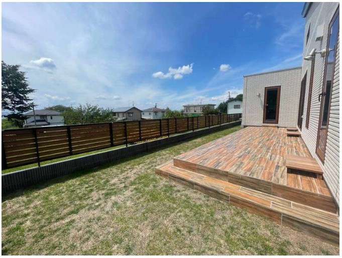 軽井沢町の個人宅にて施工したエクステリア工事です。景観に調和したトータルコーディネートで、天然芝のお庭に映える木目調タイルデッキやプライバシーを守るモダンなフェンス、土間コンクリート、犬走り、機能的な門扉やデザインポストなどを設置しました。
