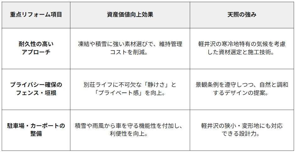 軽井沢の中古別荘リフォームで重要なのは、「別荘としての魅力」と「不動産としての市場価値」を同時に引き上げることです。投資対効果を高める3つのポイントは、以下の通りです。