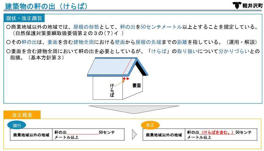 軽井沢の景観条例は、建物が周囲の自然に調和し、統一感のある街並みを形成することを求めているため、屋根の形状に具体的な基準が設けられています。